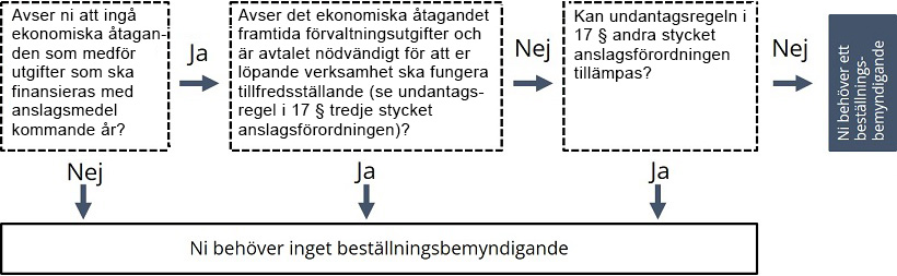 Nedanstående flödesschema kan vara till hjälp när ni bedömer om myndigheten behöver ett beställningsbemyndigande och därmed även behöver lämna förslag om detta i budgetunderlaget.